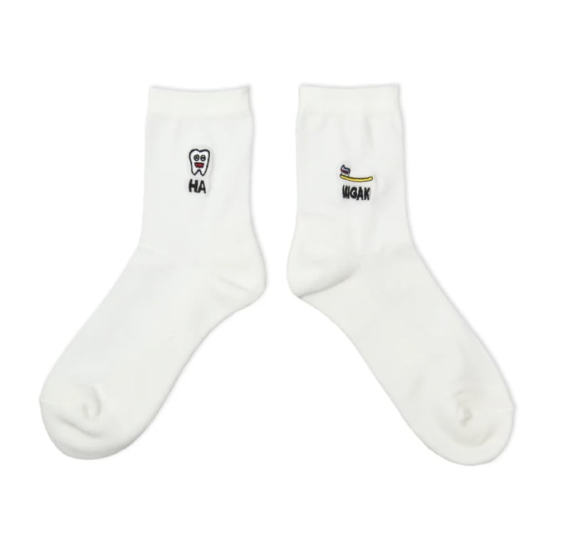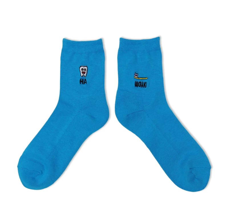 パイルソックス | HA-MIGAKIは、NEGO6がデザインした、左右非対称の刺繍(歯と歯ブラシ)が可愛いソックスです。見た目は軽やかですが、底部分はパイル加工が施されているため、驚きの履き心地を実現しています!